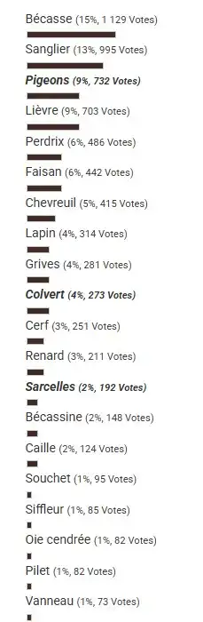 Avant-hier j’ai lancé un grand sondage sur Chasse Passion pour essayer de connaître quels étaient vos gibiers préférés. J’avoue que je ne m’attendais pas à une telle ferveur : avec 2487 votes, c’est un véritable succès qui permet de dégager une vraie tendance.