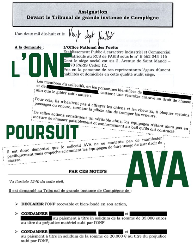 C’est ainsi que le 27 juillet, 3 membres du collectif ont reçu une assignation (voir ci-dessous) devant le tribunal d’instance de Compiègne. L’ONF réclame dans un document de 18 pages un dégagement de 55 000€ au titre du préjudice subi. L’établissement public s’appuie bien évidemment sur le délit d’entrave à la chasse.