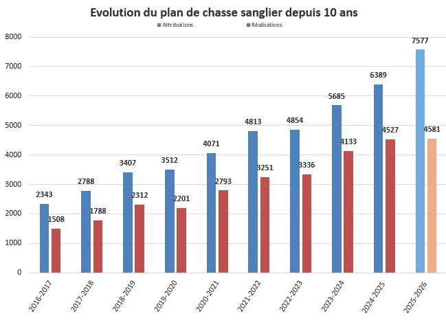 Déjà, la saison dernière avait enregistré un niveau de prélèvement exceptionnel avec 4 527 sangliers tués sur la saison, cette nouvelle saison cynégétique bat haut la main ce « record ».