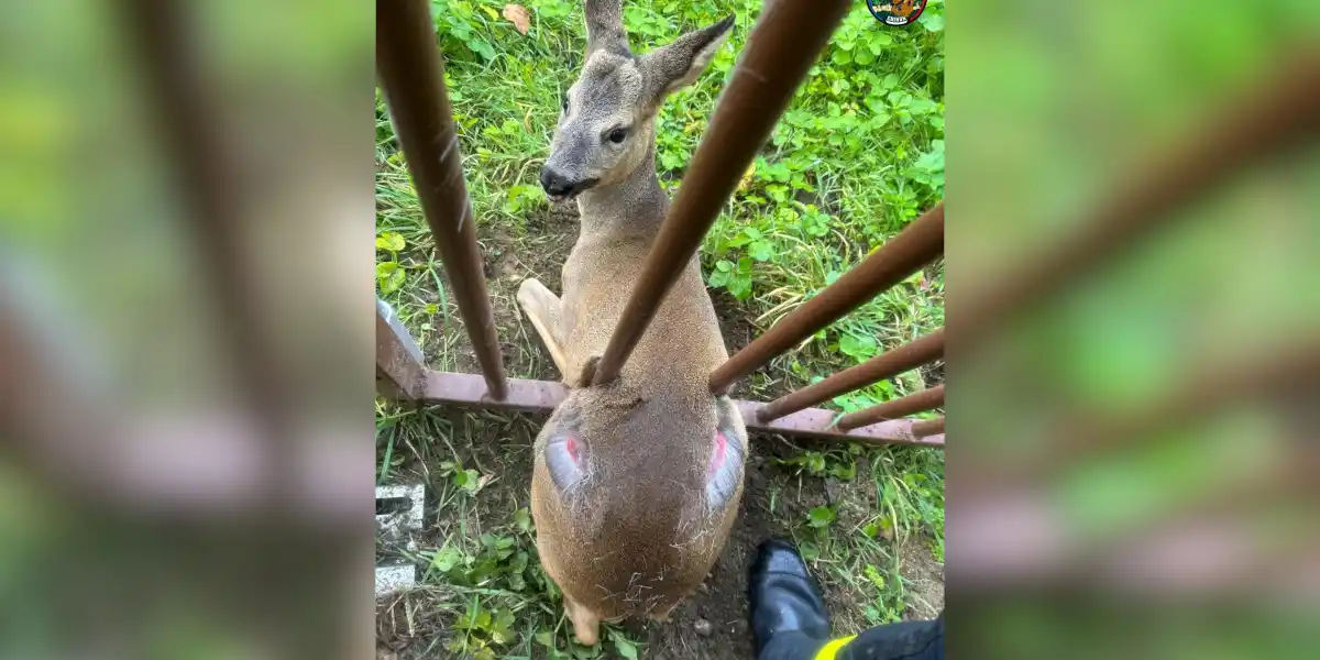 Le cervidé, probablement surpris ou effrayé par quelque chose, s’était encastré dans la structure d’un portail sans parvenir à s’en défaire.