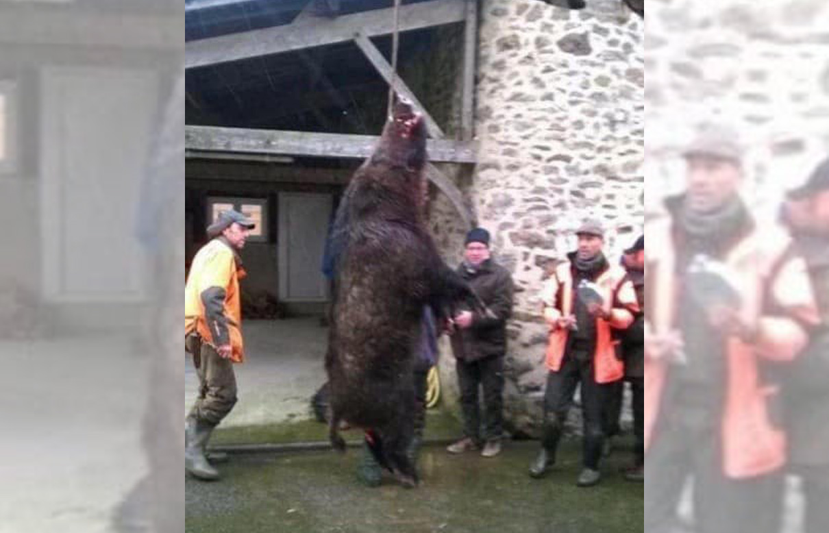 Le sanglier qui est pendu à un télescopique à côté des chasseurs paraît pourtant immense. Presque 1.5 fois la taille d’un homme, avec un corps et des épaules imposants, mais est-ce suffisant pour peser 240 kilos, Rien est moins sûr… d’autant qu’il n’y a pas de photo du peson pour attester de ce poids légendaire.