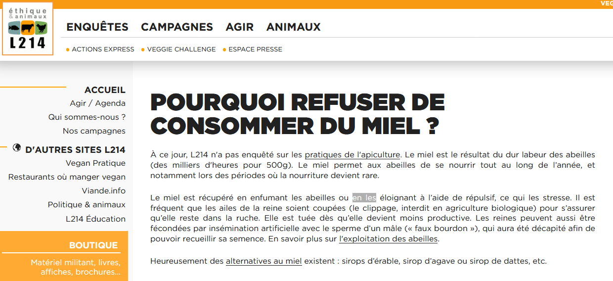 L214, c’est l’association antispéciste par excellence, contre l’élevage bien sûr, contre la pêche, contre les poules pondeuses mais également… contre le miel !