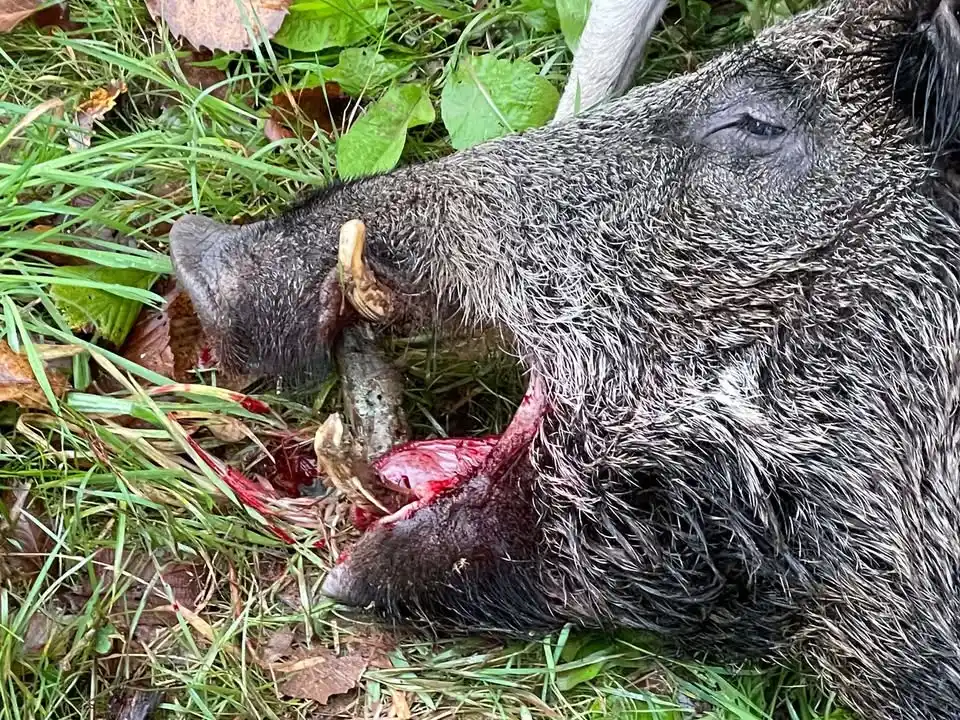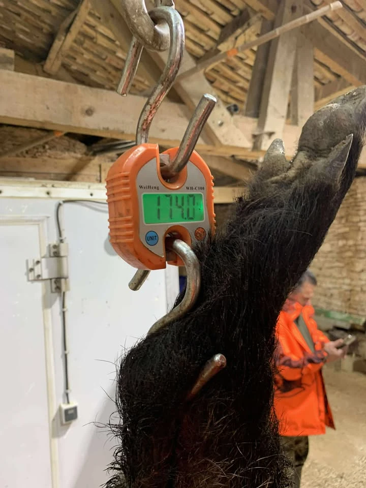Rapidement, les chiens donnent de la voix : la menée s’amplifie, la chasse s’anime. Un gros mâle solitaire, quitte le couvert à l’approche des chiens. Les abois résonnent, l’excitation monte sur la ligne.La bête noire passe la ligne de tir en revue, puis se présente à Alexandre, posté en sous-bois en bout de ligne. C’est là que l’animal s’arrêtera : un magnifique mâle de 174 kg, puissamment armé, symbole d’une belle journée de chasse collective.