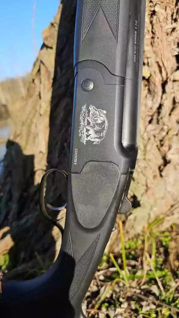 Sa bascule en ergal confère à apporter encore plus de légèreté à cette arme qui ne pèse que 2.45kg, autant dire rien. Noire, elle est ornée de simples mais fines gravures blanches de sanglier réalisées au laser de part et d’autre. Ses canons sont éprouvés billes d’acier, un détail puisqu’ils ne sont pas destinés à tirer de grenaille, et sont à chokes fixes cylindrique/cylindrique, ainsi il pourra tirer n’importe quel type de balles calibre 12, à commencer par les indémodables Brenneke. A noter que le fusil est muni d’extracteurs et non d’éjecteurs. La longuesse en forme de « bec de canard » est jolie et note un effort de la part du fabricant turc de ne pas faire de ce fusil qu’un « outil ». La crosse d’une longueur 372mm est standard et possède une plaque de couche en caoutchouc de 2cm.