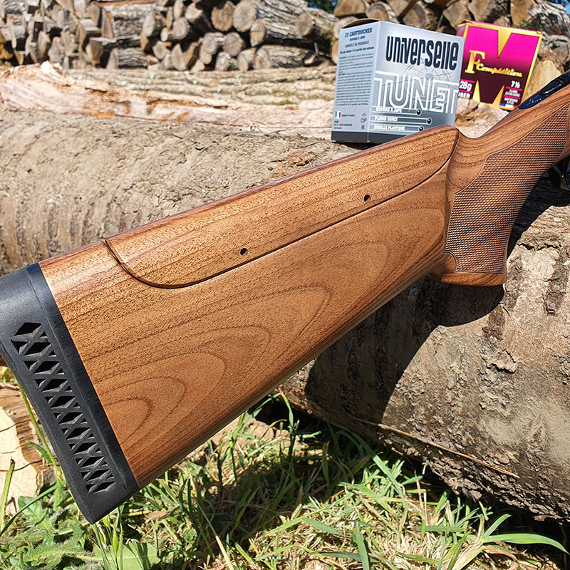 Chambré 12/76 avec un canon de 76 cm, le Huglu trap est un fusil assez massif, comme de nombreux fusils de sport. Sa longuesse imposante facilite sa prise en main et surtout son maintien. Sa longueur de crosse mesurée est standard et convient bien à notre gabarit de 1m78. Un talon amortisseur de 2 centimètres en termine l’extrémité. Cette dernière est légèrement avantagée à droite, et une fois de plus, pour notre cas, ne demanderait pas, ou peu, à être retouchée. Les gauchers devront en revanche comme toujours passer par la case armurier. Les bois de notre version d’essai sont assez clairs et joliment veinés. Est-ce notre modèle journaliste qui a été soigneusement sélectionné ou sont-ils tous comme cela ? Il semble après vérification qu’ils soient tous de cette qualité. En tout cas, pour un fusil de cette gamme, c’est très agréable ! Les quadrillages laser de la poignée pistolet sont très propres sans être les plus fins du monde. La crosse possède un busc réglable avec 2 petites vis de BTR afin de pouvoir utiliser le fusil dans toutes les disciplines.