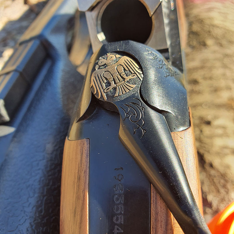 Côté canonnerie, nous sommes sur des canons de 76 cm avec chokes interchangeables de 5cm (plein, cylindrique, 1/2, 3/4, 4/4). Un petit grain d’orge jaune fluo permettra de prendre la visée. La bascule en acier est entièrement noire avec quelques gravures types arabesques. Pontet, de détente sont également noirs. La seule « excentricité » est sur la clé d’ouverture du fusil qui est ornée du logo Huglu doré, très belle d’ailleurs.