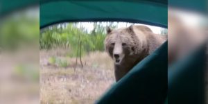 La vie en pleine nature est loin d’être de tout repos comme ce campeur va pouvoir en faire l’expérience. Alors qu’il entend du bruit autour de sa tente, il va ouvrir la toile pour observer ce qu’il se passe mais va se retrouver nez à nez avec un ours de belle taille.